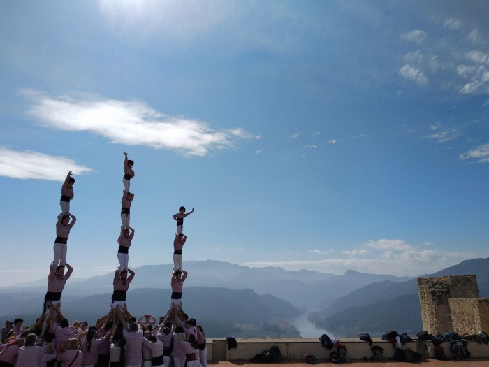 Vam arribar dissabte molt d’hora a Miravet per poder pujar al castell de la localitat. Després d’una bona passejada acompanyats d’uns guies turístics vam pujar a dalt de tot del castell on vam fer un vano de 5. Quan vam tornar a baixar al poble els companys de Lo Fardell Patxetí ja ens esperaven per fer-nos un taller de jotes. Vam intercalar uns quants balls de jotes amb els nostres castells. Finalment vam baixar a la llera del riu per fer un altre vano de 5. A part de les jotes, els amics de Lo Fardell ens vam preparar una beguda típica de la zona, el vermut patxetí. També ens van preparar una fideuà boníssima per dinar acompanyada amb una clotxa, un plat també típic de la zona.